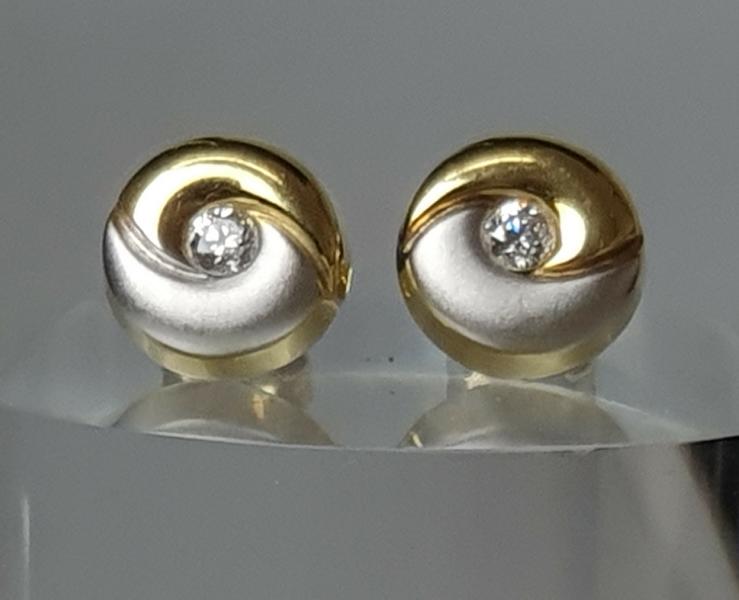 Yin & Yang Bicolor Ohrstecker mit Zirkonia Schmuckstein aus 585er Gelb- Weissgold Goldgehalt: 585 (punziert) Durchmesser: 10,5 mm Anzahl Schmucksteine: 2 Zirkonia im Brillantschliff Gewicht 1,7 Gramm Artikel aus 2. Hand. Zustand: sehr gut