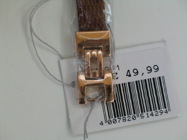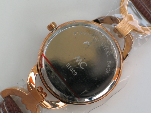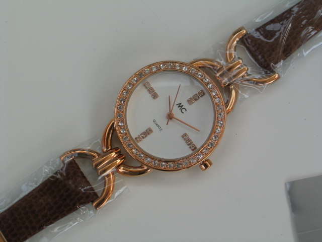 MC Damenunr mit echt Leder- und Metallband Lünette besetzt mit Schmucksteinen Geschlecht: Damen Uhrwerk: Quarzwerk (HIgh Quality Movement) Ziffernblattfarbe: weiß Stabindexe mit Schmucksteinen Funktionen: Stunde/Minute/Sekunde Gehäusedurchmesser: 30 mm Gehäusehöhe: 9 mm Gehäusedeckel: Edelstahl Gesamtlänge: 19,0 cm Banddurchmesser: 13 bis 18 mm Bandfarbe: braun/gold Schließe: Stegleiternverschluss