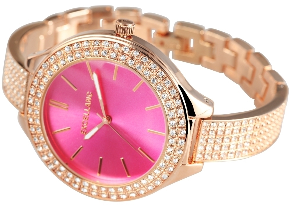 Die Analog Damenuhr der Marke Excellanc verfügt über ein Hochwertiges Quarzwerk. Das Metallarmband ist 12 mm breit und wird mit einer Clipverschluss geöffnet. Die Gesamtlänge beträgt 19.5 cm. Das Metallgehäuse mit Mineralglas hat eine Abmessung von 44 mm und 11 mm Gehäusehöhe. Aufgewertet wird das Gehäuse mit Crystal-Besatz. Der Gehäusedeckel ist aus Edelstahl gefertigt.