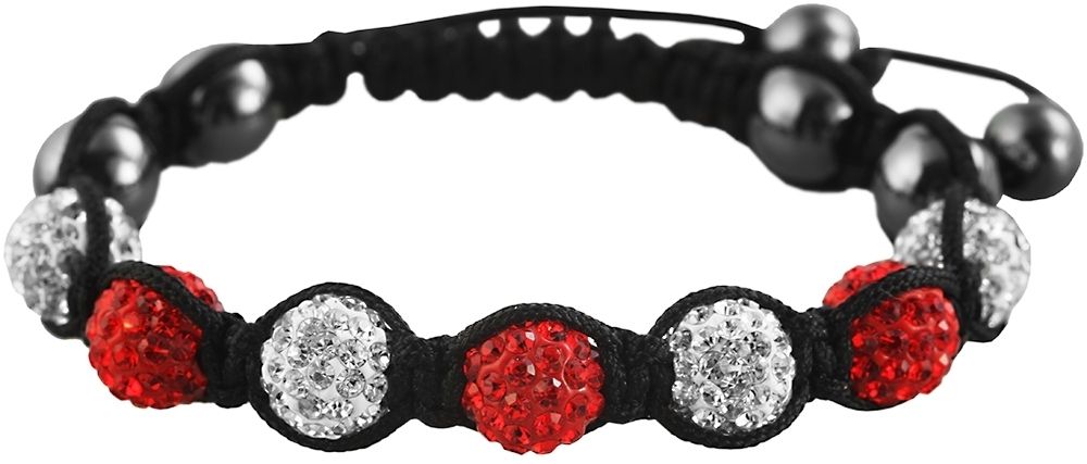 Das Armband wurde aus Textil gefertigt. Als zweites Bandmaterial wird Kunststoff verwendet. Die Farbe des Armbandes ist Rot/Weiss/Schwarz Der Durchmesser beträgt 60 mm. Die Breite beträgt 10 mm. Verziert wird das Armband mit Zirkonia Steinen.