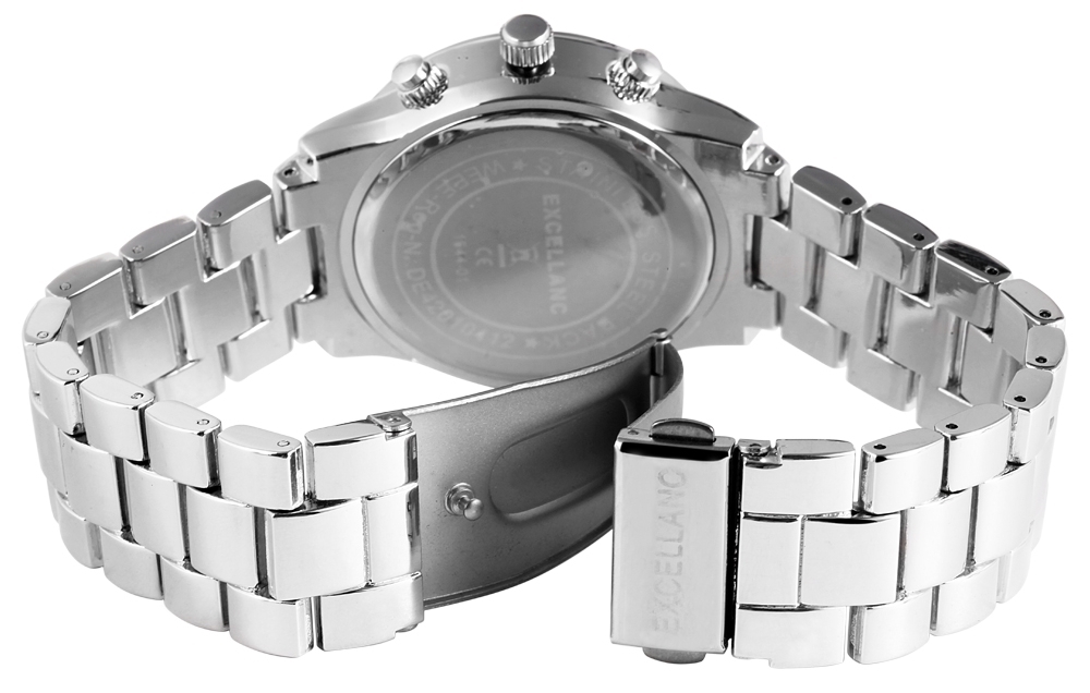 Die Analog Damenuhr der Marke Excellanc verfügt über ein Hochwertiges Quarzwerk. Das Metallarmband ist 20 mm breit und wird mit einer Edelstahlfaltschließe geöffnet. Die Gesamtlänge beträgt 20 cm. Das Metallgehäuse mit Mineralglas hat eine Abmessung von 38 mm und 8 mm Gehäusehöhe. Der Gehäusedeckel ist aus Edelstahl gefertigt. Weiteres Merkmal ist:Chronolook.