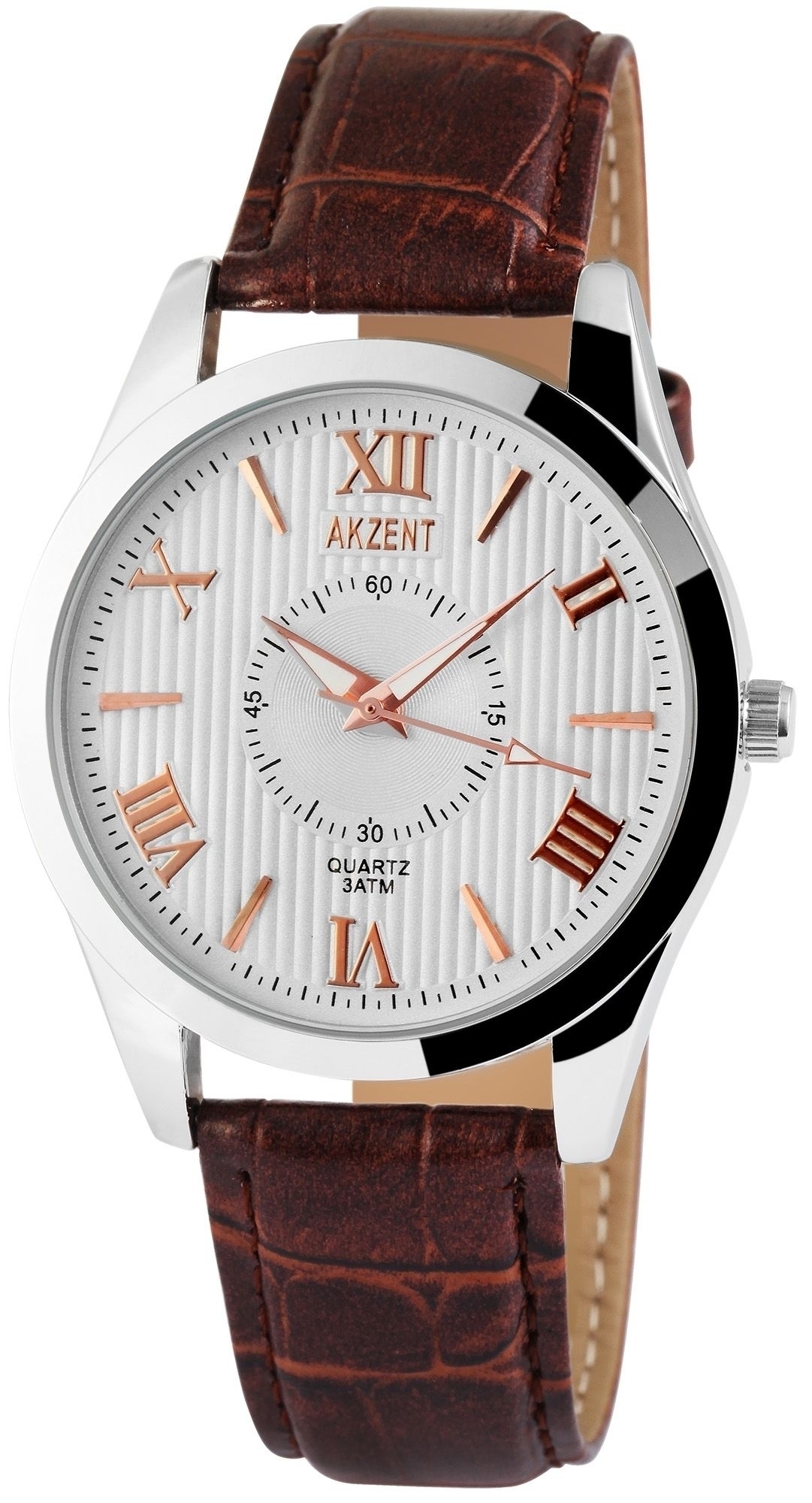 Die Analog Herrenuhr der Marke Akzent verfügt über ein Hochwertiges Quarzwerk. Die Modellbezeichnung ist AK0085. Das Kunstlederionarmband ist 20 mm breit und wird mit einer Dornschließe geöffnet. Die Gesamtlänge beträgt 20 cm. Das Metallgehäuse mit Mineralglas hat eine Abmessung von 40 mm und 10 mm Gehäusehöhe. Der Gehäusedeckel ist aus Edelstahl gefertigt. Die Uhr ist 3 ATM druckgeprüft.