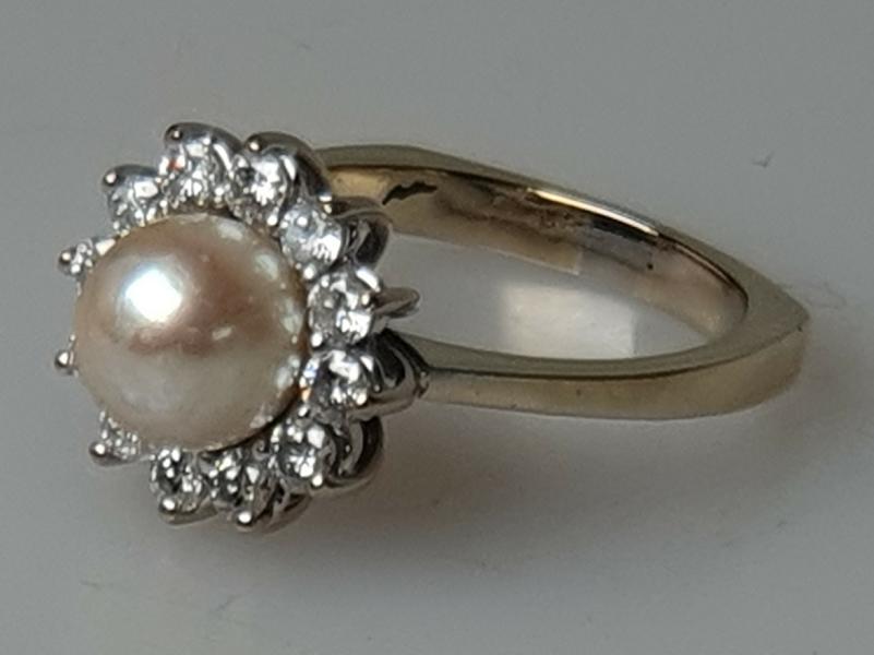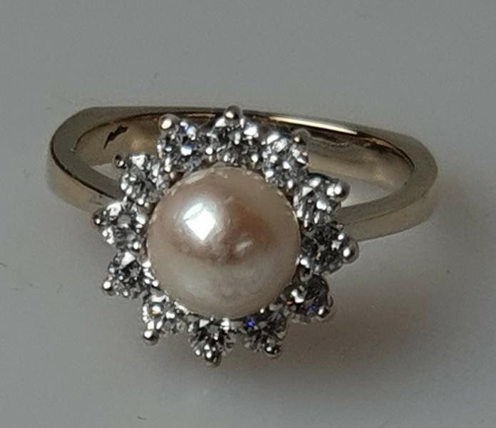 Halo Schmuckring aus 750er Gold mit Perle und 12 Diamanten, Größe 58, Gewicht: 7,3g