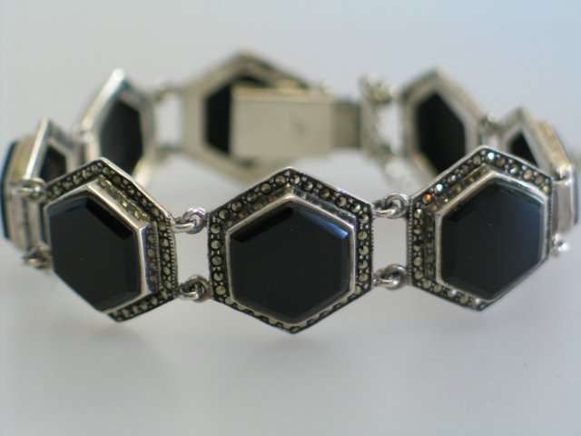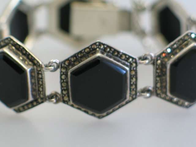 Armband aus 925er Sterlingsilber im Art Deco Stil mit Markasiten und Onyx Schmucksteinen in Hexagon-Form