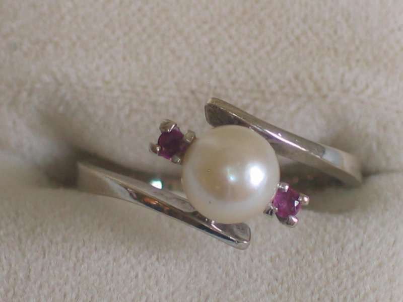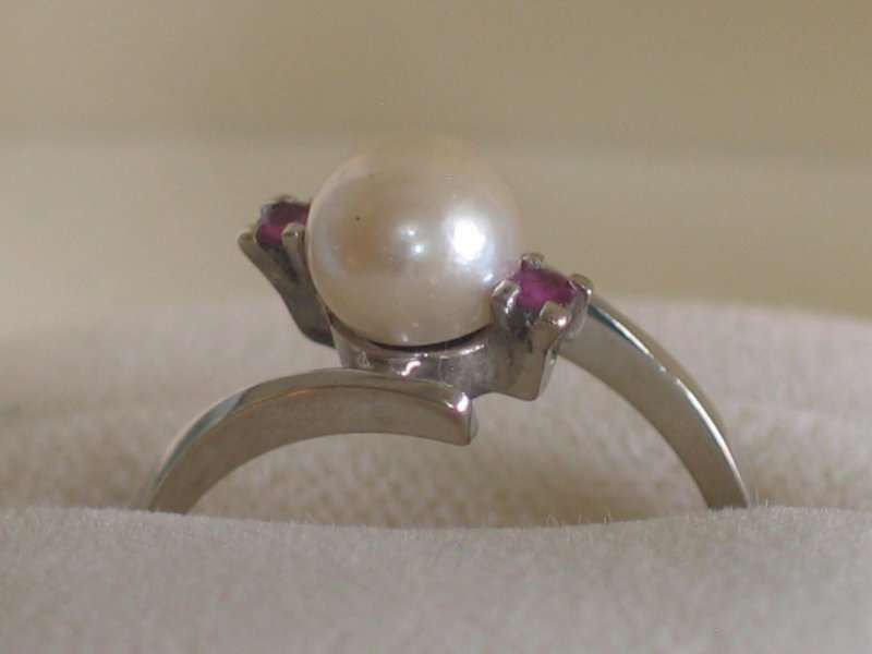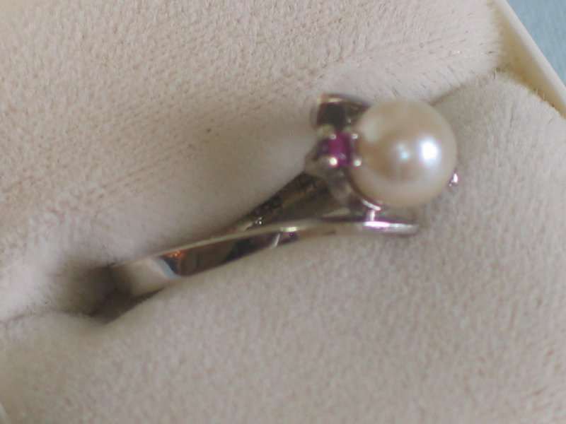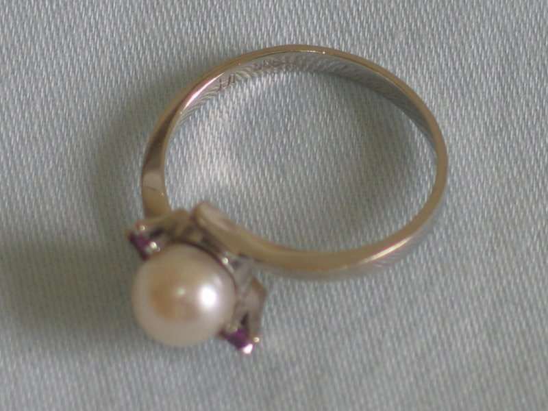 Perlenring mit 2 Rubinen aus 585er Weissgold Goldgehalt: 585 (punziert) Ringinnendurchmesser: 17,8 mm Ringkopfmass: 10,0 mm Hintere Ringschiene: 2,0 mm Gewicht: 2,7 Gramm