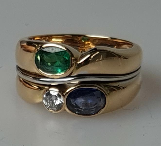 Ring aus 750er Gelb und Weißgold mit je einem Diamant, Smaragd und Saphir Edelstein