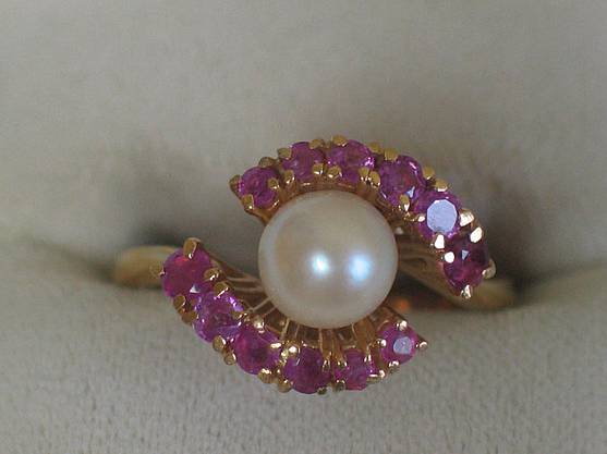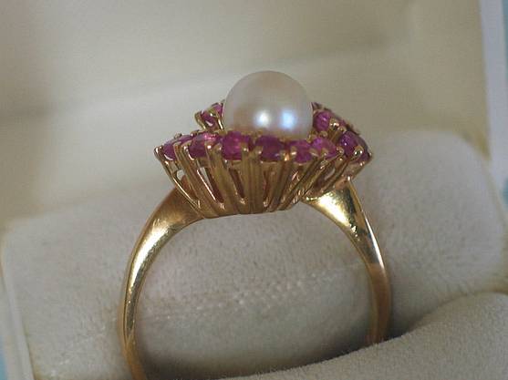 Eleganter Rubinring mit Zuchtperle aus 750er Gelbgold, Größe 60, Gewicht: 5,6g