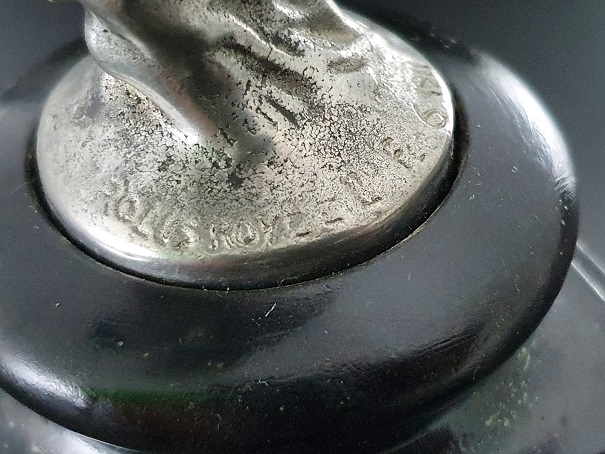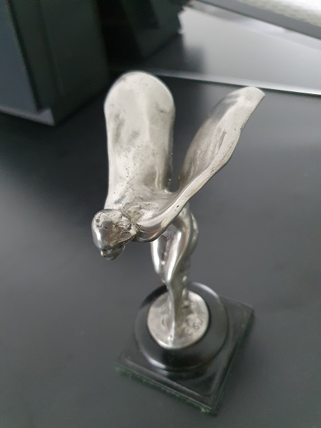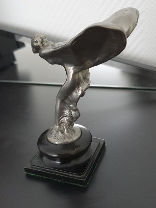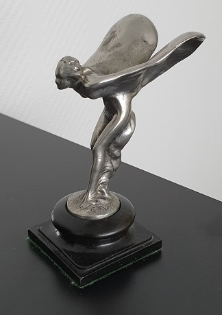 Rolls-Royce "Spirit of Ecstasy" Kühlerfigur auf Holzsockel (1911), Figurhöhe ca. 12,5 cm