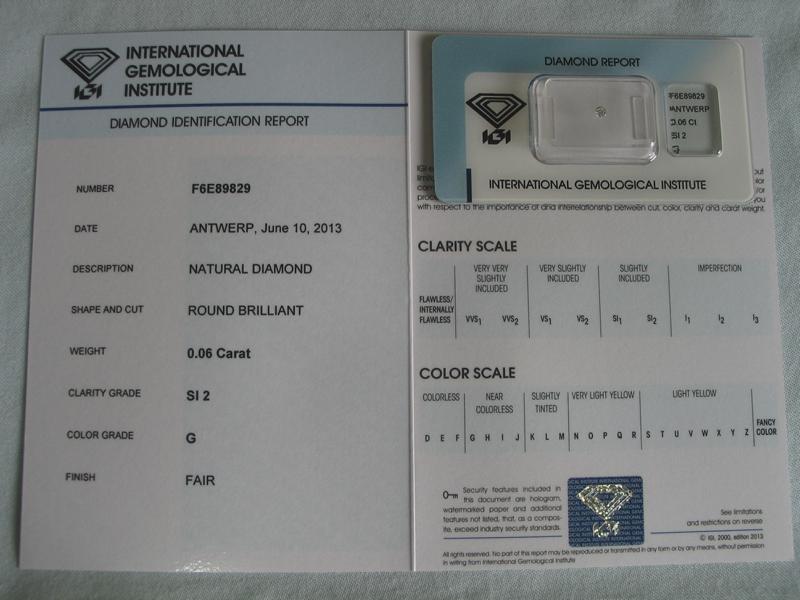 Diamant im Brillantschliff 0.06 ct / SI2 / G / Fair / mit IGI Report