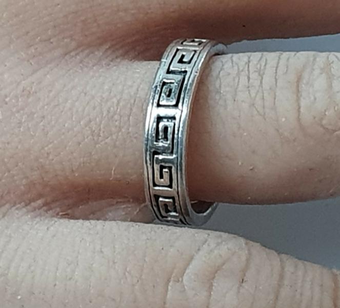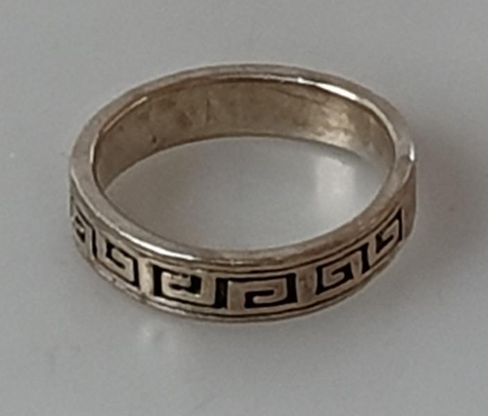 Mäander Bandring aus 925er Sterlingsilber Feingehalt: 925 (punziert) Ringinnendurchmesser: 17,6 mm (Gr. 55) Hintere Ringschienenbreite: 4,6 mm Ringkopfmaß: 4,6 mm Gewicht: 3,8 Gramm Der Artikel ist aus 2. Hand, Zustand : sehr gut